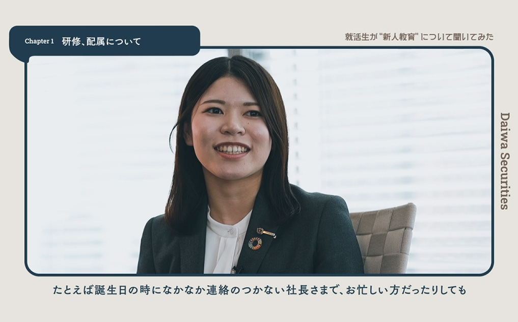 「普通の大学生」が大和証券で働く「元・普通の大学生」に、大和証券における新人教育についてインタビューしていく動画です。研修や配属についてや、入社後どのように成長できるか等、入社後のイメージができる内容を掲載しています。