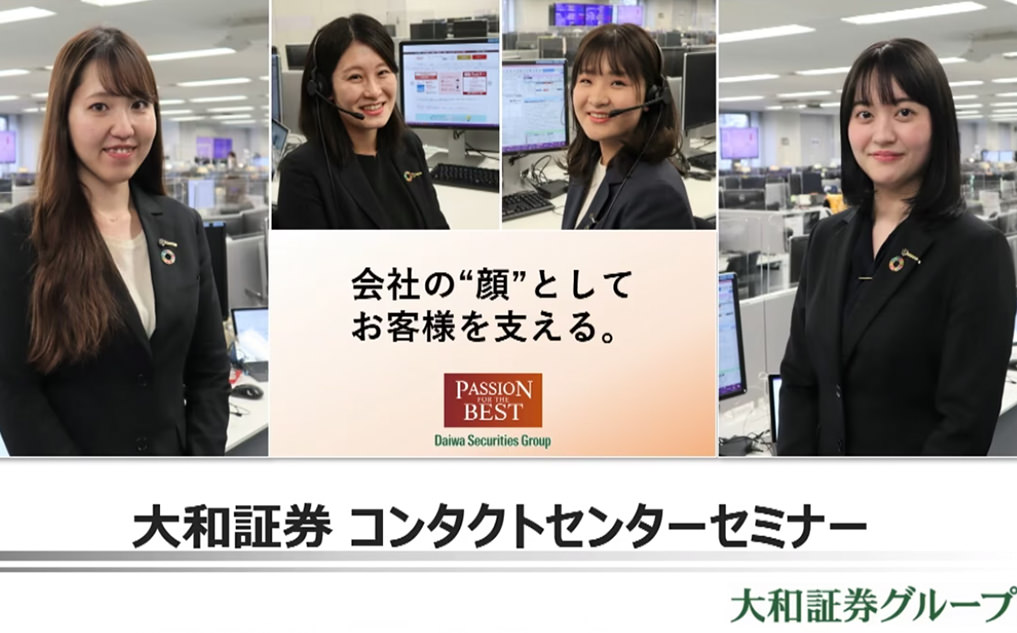 大和証券の顔として活躍するオペレーター(電話対応)の業務を具体的にイメージしていただくためのセミナーです。東京コンタクトセンター部の職場風景を動画でご視聴いただけます。さらに、コンタクトセンターの先輩社員が登場し、仕事における「やりがい」や「魅力」をリアルにお伝えします