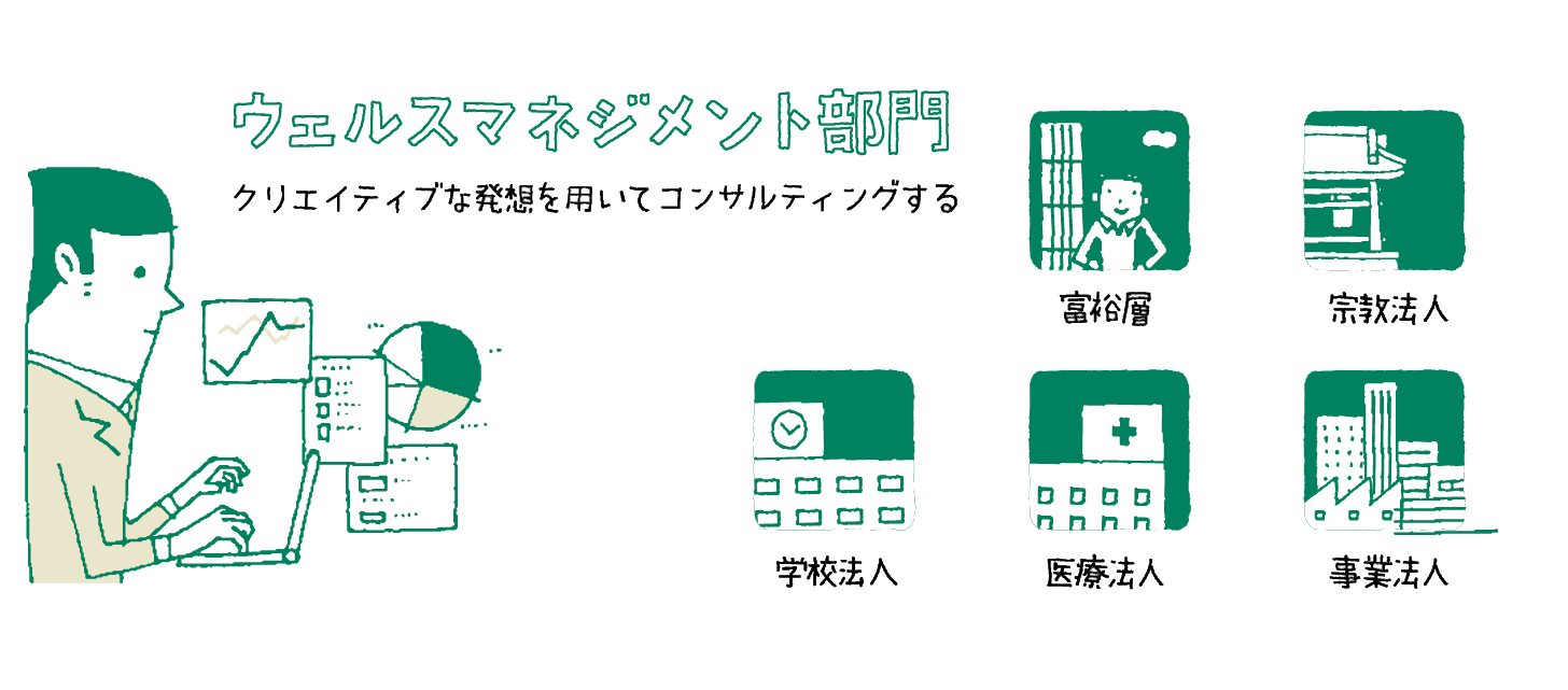 主なお客様層は、未上場の事業法人や学校法人、医療法人やその経営者である富裕層など。 幅広いニーズやお悩みを抱えるお客様だからこそ、クリエイティブな発想が求められる仕事です。
