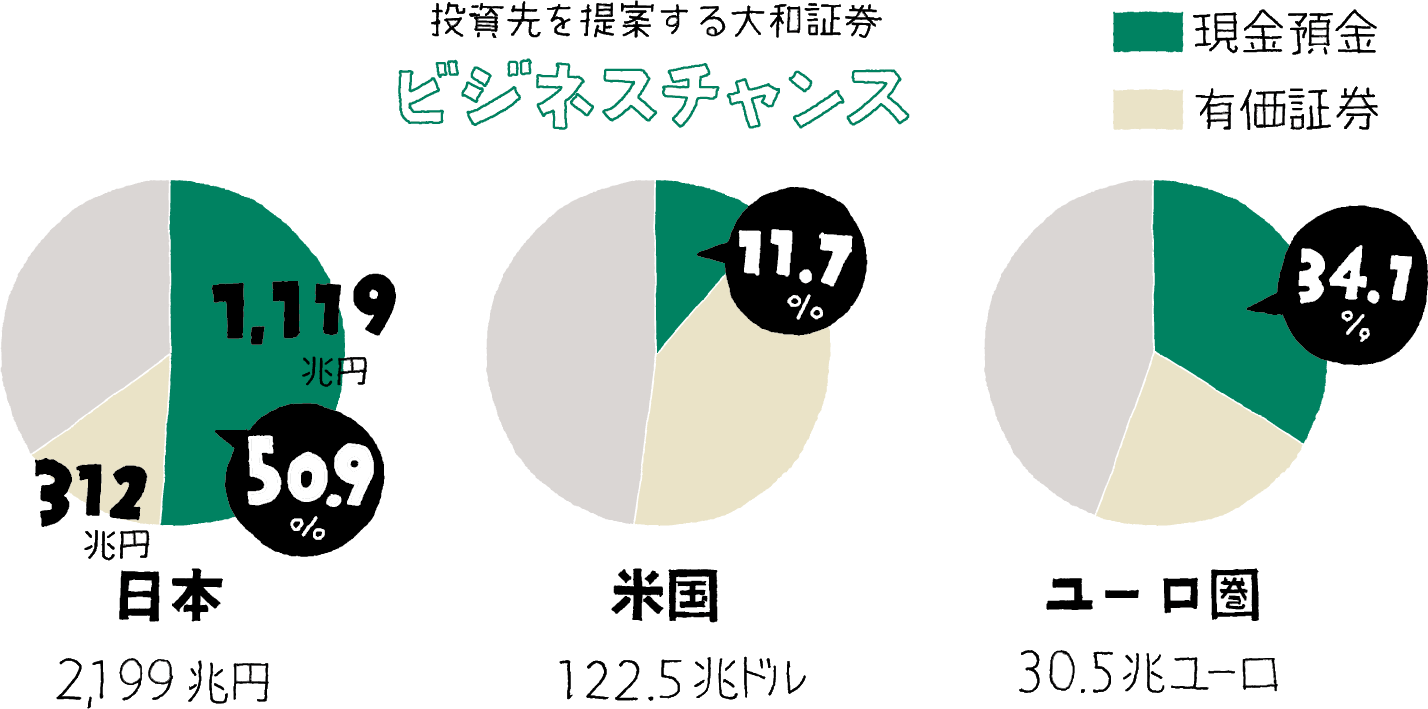 日本の個人金融資産のうち過半にあたる1,000兆円以上が、未だ現預金として眠っています。「貯蓄から投資」の進展により、日本の個人金融資産における有価証券の割合が、例えば欧州の30%程度に近づいただけでも約300兆円もの規模でビジネスフィールドが拡大します。日本の証券ビジネスは、ソリューション領域の拡大も含めて、膨大なポテンシャルを秘めています。
