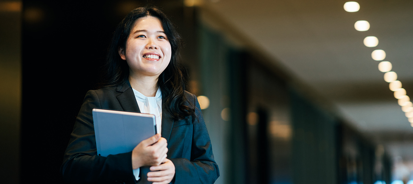 大和証券への入社動機は「人」に魅力を感じたから。就活中、説明会や電話等で社員と話しをする機会があり、いつも親身になって相談を受けてくれる姿勢に強く惹かれたと言う。「こういう人たちと一緒に働きたい」という気持ちが入社を後押しした。
