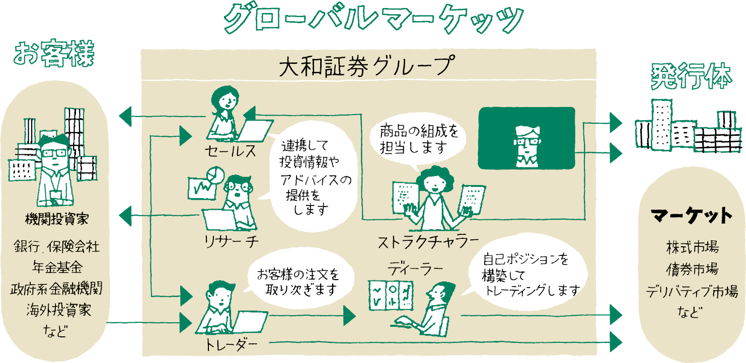 グローバルな経済・株式市場、最新の業界動向を常に意識しながら、機関投資家に向けて、株式、債券、デリバティブ等の情報提供や運用提案、注文の執行を行います。